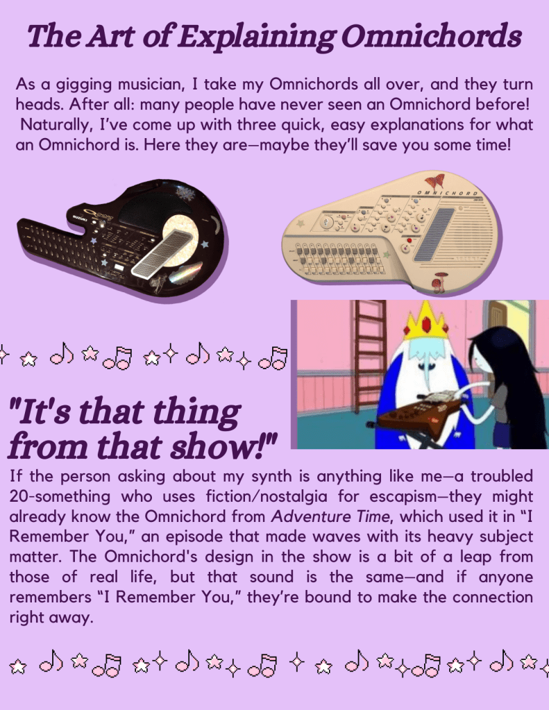 Also in print, Alex has designed works for a number of zines! In 2023, they had the opportunity to write and design a piece for an independent zine about Omnichords: