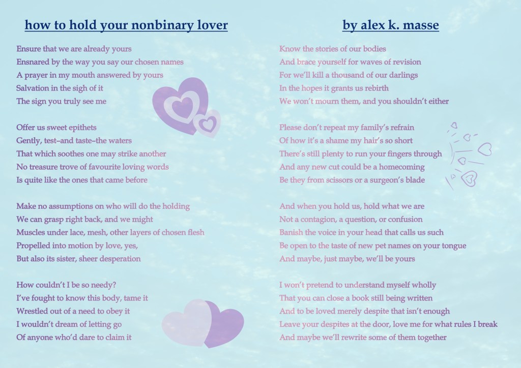 In 2024, Alex had the privilege of being included in Stealth Codes by Angelic Goldsky, a exhibition for that year’s Queer Arts Festival at The Roundhouse. They created the poem The Lovers That Launched A Thousand Censorships, and then elevated it to an AR piece, allowing users to place the poem anywhere they please, in defiance of queer erasure and censorship in digital spaces.